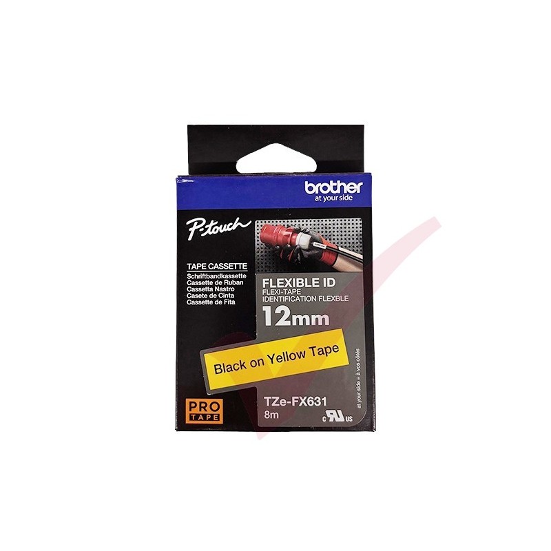 Ideal for producing identification labels for cables, wires, PVC tubing or anything else cylinder-shaped, the special adhesive on the Brother TZe-FX631 black on Yellow labelling tape ensures that your important labels stay put for longer.