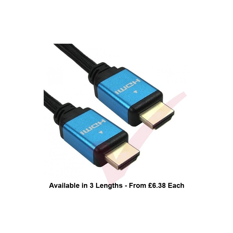 Black braided cable with Blue aluminium shell - 1m & 2m 30AWG; 3m 28AWG 3m, they are backward compatible with all preceding HDMI standards
